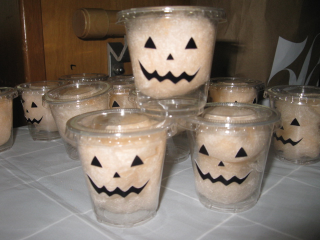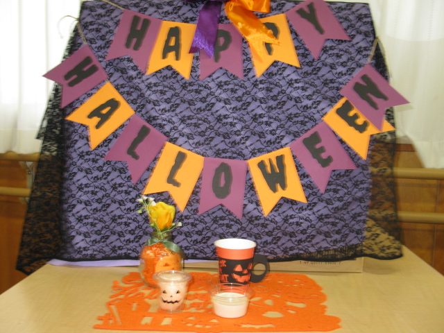 ハロウィンらしく飾り付けしておやつを食べました ほうじ茶プリンはとても好評でしたよ!